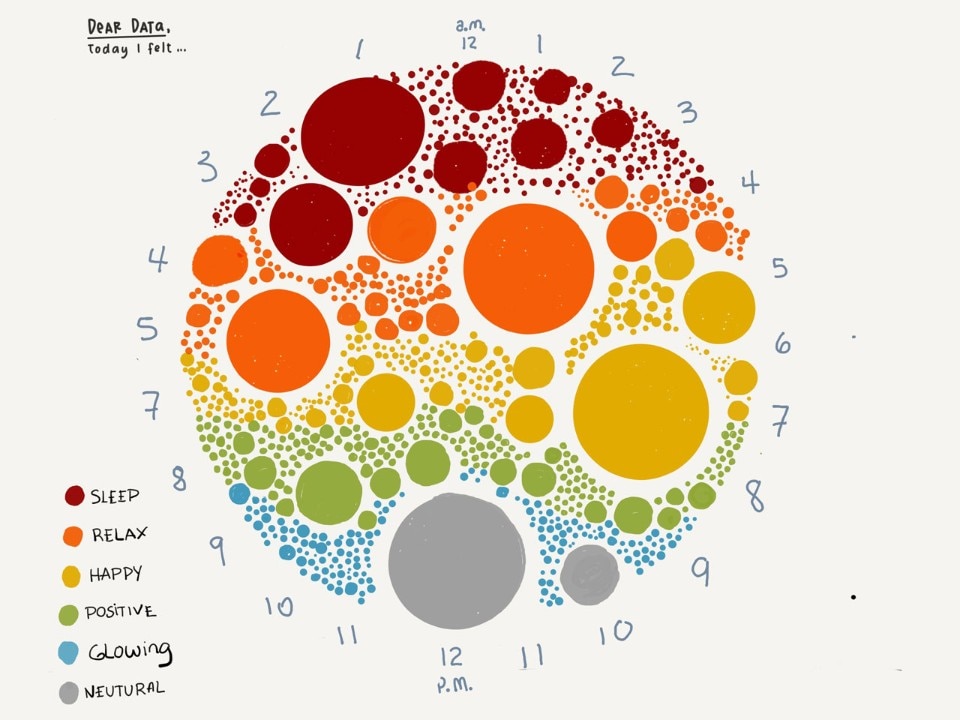 Giorgia Lupi + Stefanie Posavec: We are very satisfied with the circulation and participation that the project has seen. There are hundreds of people from all over the world with very diverse backgrounds who are experimenting with their own personal data and sharing the results with us. Teachers from all sorts of of schools use the Dear Data method to teach students how data function, and we have seen results of very high-quality graphics created by youngsters. We believe that working with data in an analog, personal way like we propose has given a non-specialised audience more familiarity with this field, bringing it closer to everyday life. Our intentions are to involve an increasing amount of people
