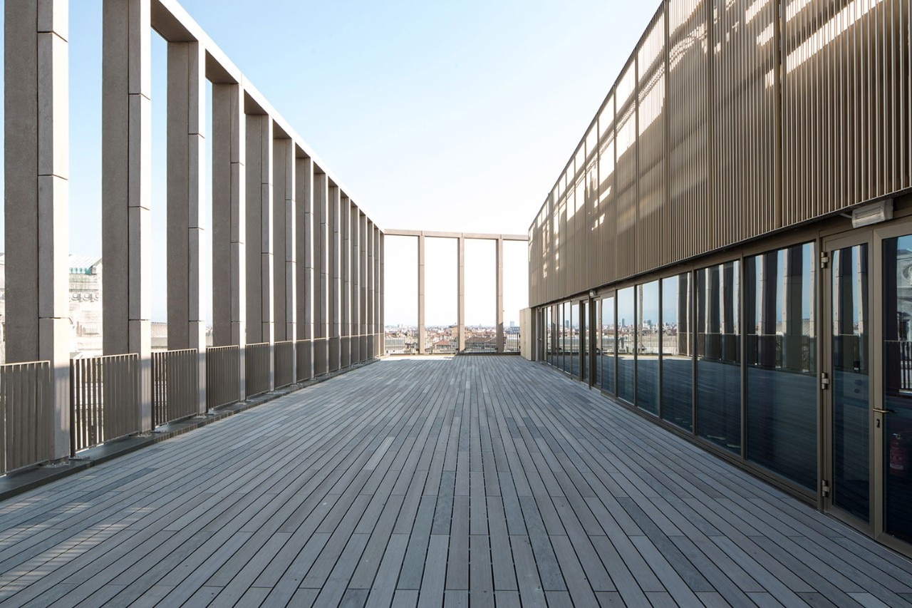 An eloquent example is the renewal of a hotel (2015) on Piazza Duca d'Aosta in Milan, part of the urban front that constitutes a modern, monumental entrance to the city from Stazione Centrale. The design was for the facade and the continuity of this image while incorporating the colours and skeleton of the original 1953 building by Mario Baciocchi. The strict structural grid was transfigured by adding a curtain wall of prefabricated reinforced-concrete. Under a lightweight crowning of the upper floors, splayed modules show a more marked verticality than Baciocchi's scheme. On the ground floor, the chamfering in section of the pillars shifts the appearance of the building from the stereotomy of the existing building toward the more graceful proportions of the Pirelli Tower across the way.