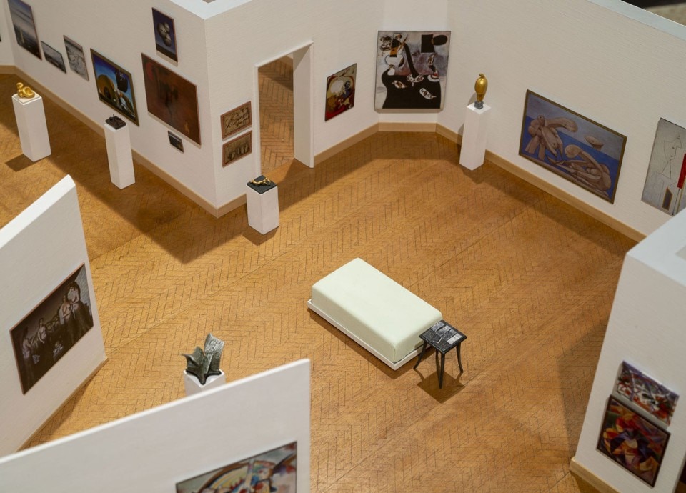 Ivan Simonato made a scale model of the pavilion, with the structural details of Scarpa’s exhibit design and miniaturised versions of all the artworks it hosted based on ten black-and-white pictures from the Guggenheim archive. The model allows visitors to appreciate how the sequence of pieces was studied to make legible the passage between artistic currents, showing their common traits and differences. A selection of documents, photographs and letters gives access to Peggy’s world as an idiosyncratic self-described art addict who in 1948 was at the centre of a sort of revolution in the art scene that gave birth to a lively debate involving the general public and art critics. Her pavilion received much praise, although not everyone understood it. This confusion can be seen in some press headlines. “The Exhibition of Wonders or Guggenheim’s Noah’s ark?” one reads. Another: “Apologies, We Laughed.”