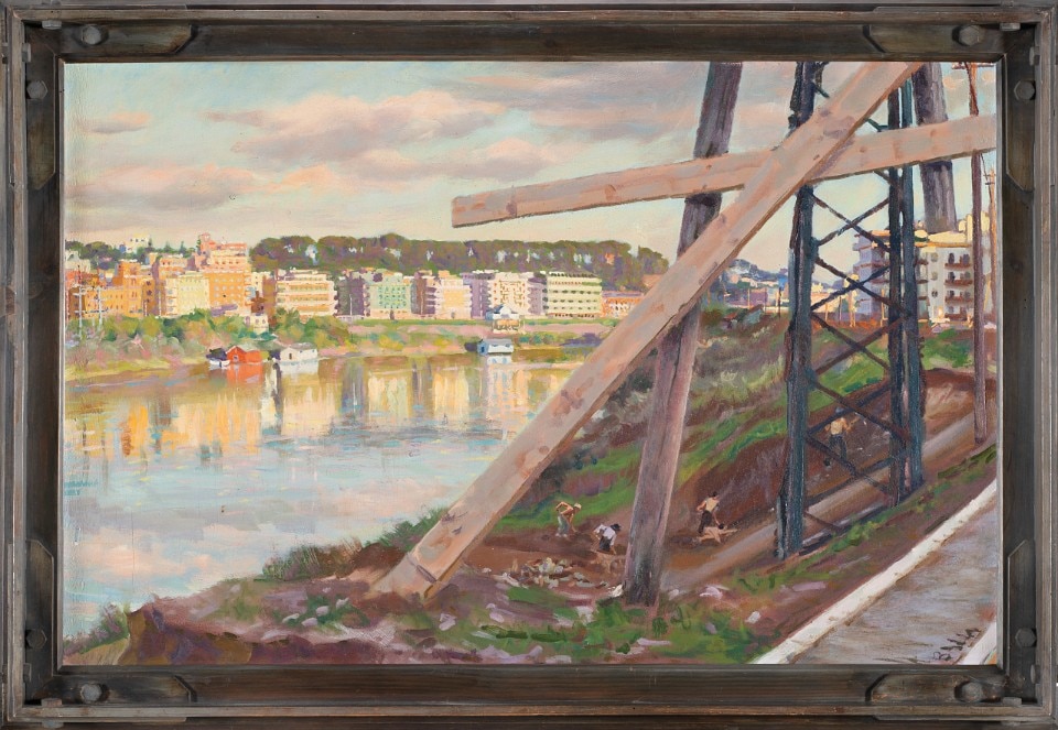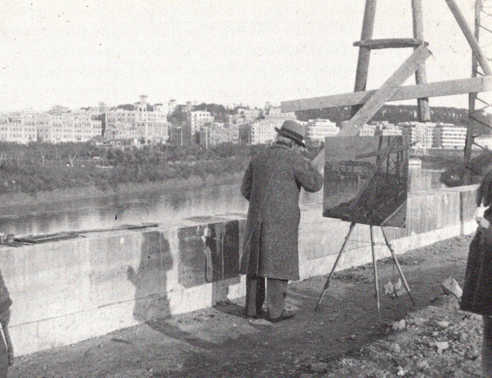 Giacomo Balla’s 1942 La città che avanza (Expanding City) depicts Rome’s Lungotevere Flaminio and the Lungotevere della Vittoria under construction. “That November, after several observations, my father who always used to go and look at the river” recalls Elica Balla, “decided to paint a view of the Tiber waterfront including the recently built houses reflecting in its waters, the San Valentino hill in the background, and a crane with workers on the building site by the river. It’s the city irretrievably expanding, the poetry remains above the bright sky and in the beautiful reflections in the water; this is a very important painting because it reaches beauty in the completeness of the picture as a whole, in the magic quality of colour, while also describing our time in the ever-expanding city destroyer of rural poetry. This painting was then bought by an engineer…”.