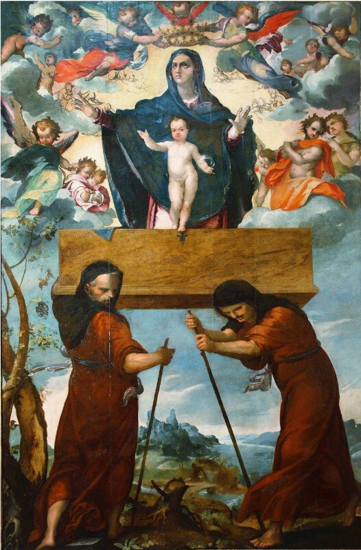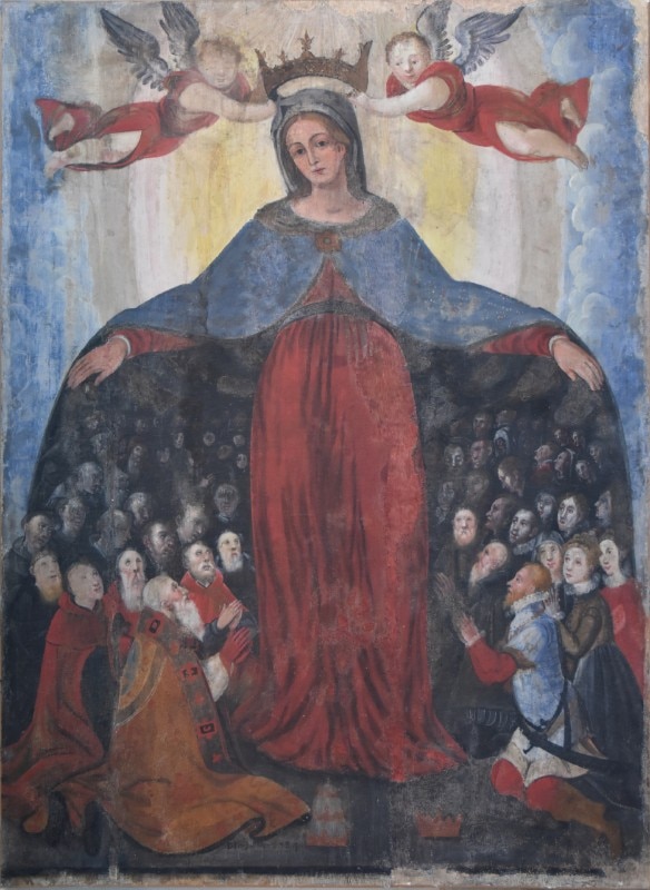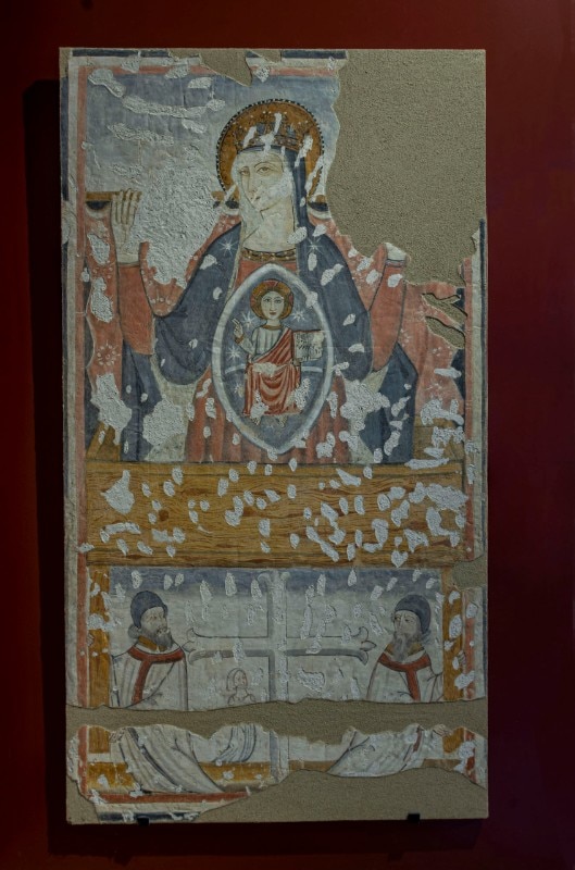 The painting on display expresses and provides a new interpretation of the iconographic transformations of the Virgin Hodegetria, a model passed on from the Byzantine world. The most well-known icon initially presented the Virgin painted as a half-figure, holding the Child Jesus, who has his hand raised in the act of blessing. However, from the 16th century onwards, the icon became more complex. The Virgin is standing on a wooden box carried on the shoulders of two Basilian monks, an explicit reference to the legends regarding the purloining and the hiding in a box of the miraculous icon that legend narrates was painted by Saint Luke and was considered to offer protection to the people of Constantinople before its definitive fall in 1453.