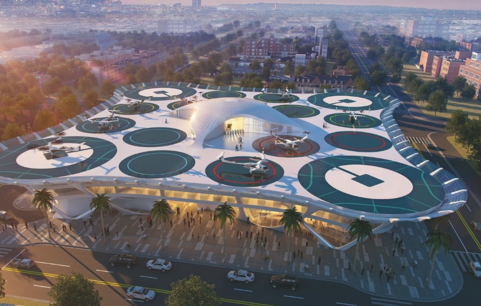Opening image: the design concept by the studio Gannett Fleming for the Uber Elevate Skyport Challenge, an idea of an intermodal urban hub