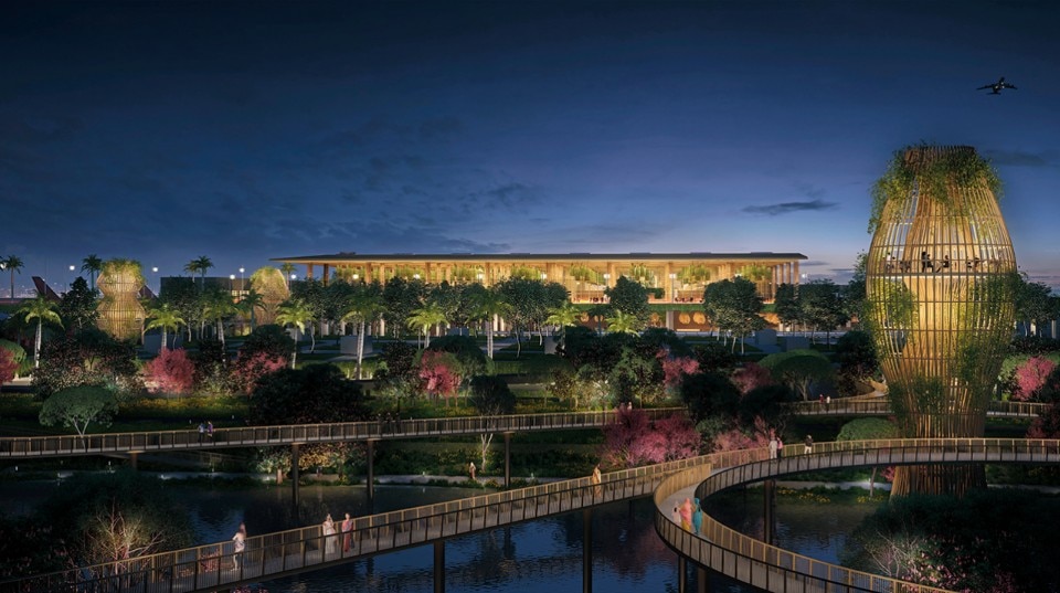 The head house and departures lounge blocks could sit well inboard from the pier, separated by a 90-meter wide empty zone – a zone that would become the “forest belt” enveloping the terminal. The forest belt is lushly planted and dotted with fanciful structures – garden follies – that house coffee shops, restaurants and other amenities.