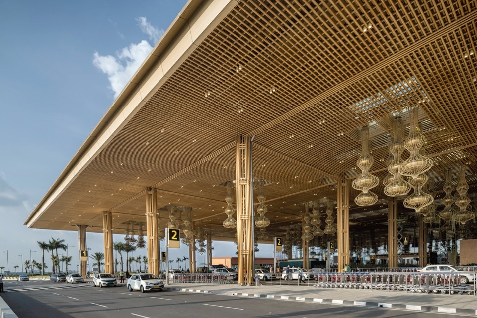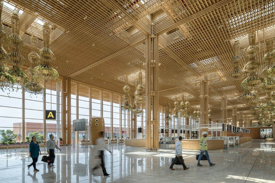 The technology aspect of the terminal’s character is, in the end, less evident. This is appropriate – processing technology should facilitate east passage and not be obtrusive. SOM and BIAL avoided large garish and ephemeral digital displays. The primary visual elements are natural, organic – the bricks locally produced, the stone quarried and worked near Bengaluru, and the engineered bamboo lattice formed around the lightweight structural steel frame of the departures level.