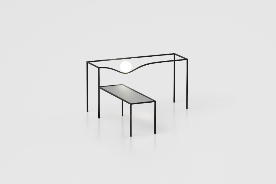 The lamp, which carries the design on paper into the actual space, is based on a rather simple idea: a barely-there metal frame that is made to seem intentionally folded or bent under the weight of a frosted glass sphere.
