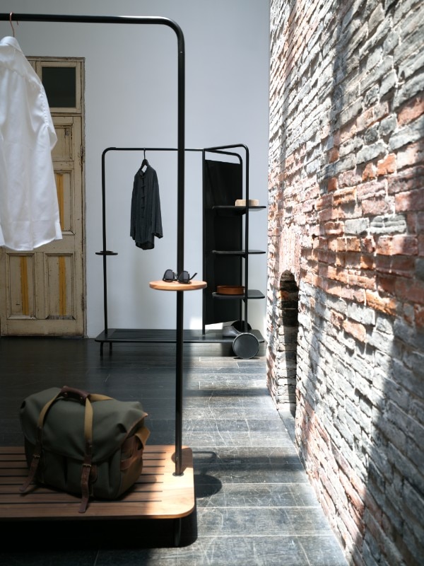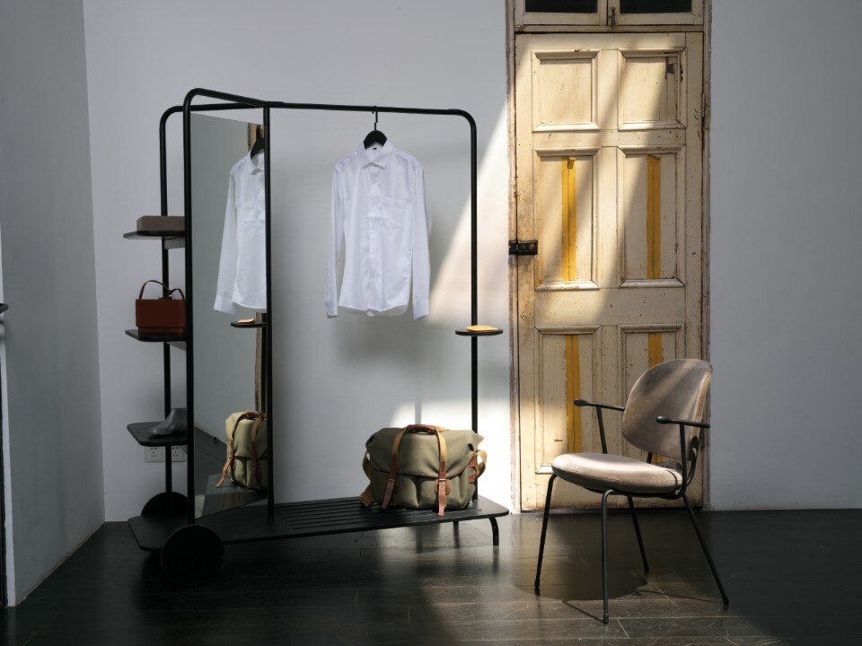 Unveiled at Design Shanghai, Host is not just a simple coat rack but a multifunctional piece of furniture conceived in response to the growing need for changing living spaces. The structure, with its minimalist design, comprises a steel frame equipped with a system of visible shelves and storage units, an integrated mirror and a solid wooden base which, thanks to its integrated wheels, allows it to be moved easily.