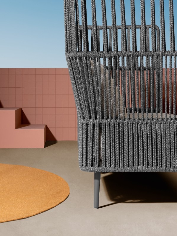 The weave made of polypropylene rope accentuates the sophistication and almost vegetal character of this collection while guaranteeing durability, sturdiness and resistance to atmospheric agents. Thanks to the large polyurethane foam cushions covered in water-repellent fabric, these furnishings are stain-proof and can be easily cleaned with water.