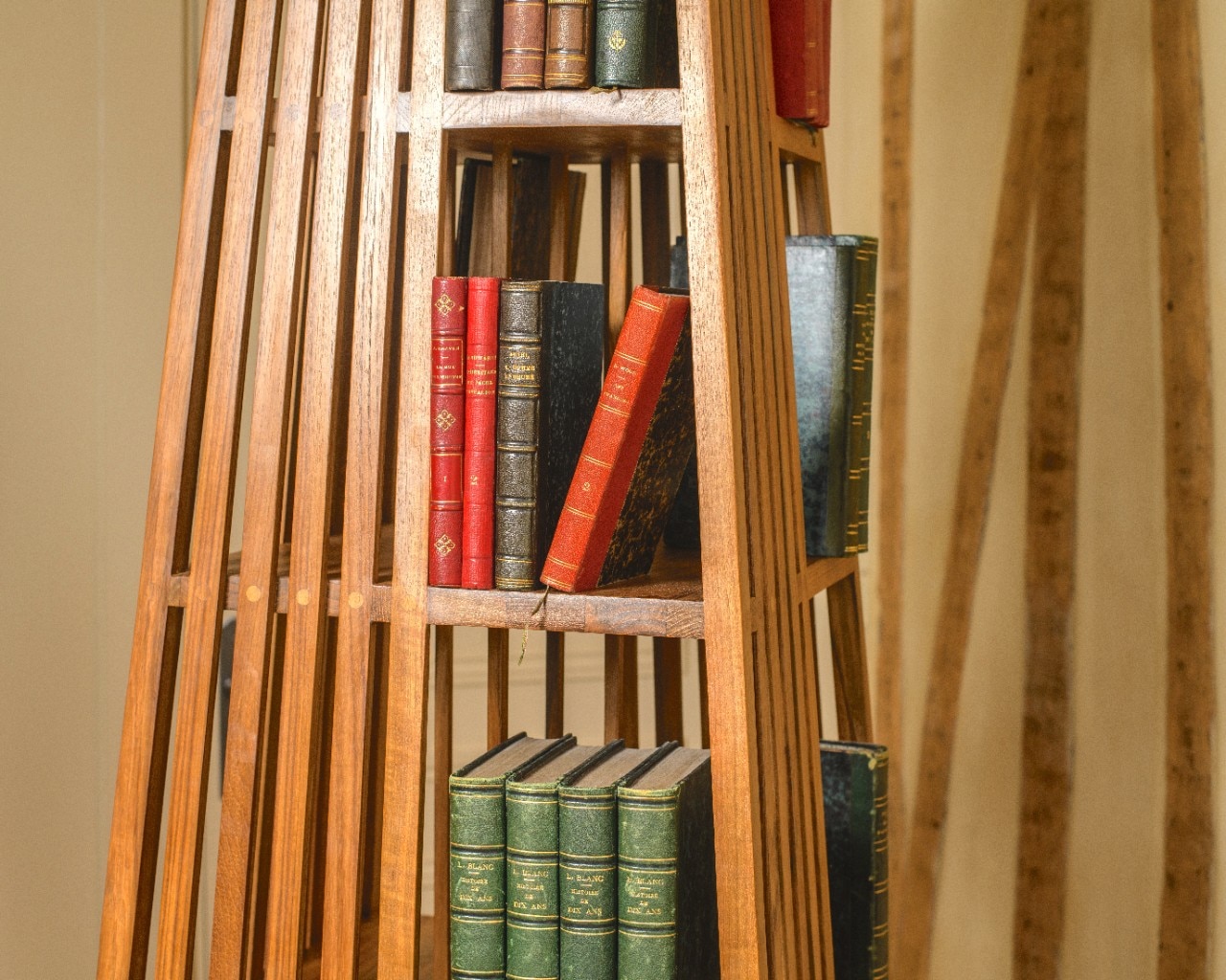 Biblos is a treat for all book lovers. It was designed by Alexis de La Falaise, a French artist who passed away in 2004 and an esthete who was driven by his great love for art and design and was passionate about the history of decorative arts. Thanks to its unique design, all books can be accessed in a dynamic way, from the bottom of the pyramid all the way to its top.