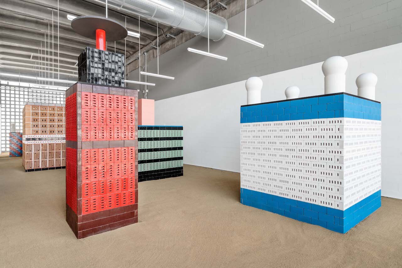 This article was originally published on Domus 1042, January 2020 Bricks? They are the “module par excellence; cheap and you can build everything with them”. Nathalie Du Pasquier, an artist – native to Bordeaux, in love with Milan since she moved there in 1979 and from when she helped to found, in the 1980s, the Gruppo Memphis – began with bricks to create her latest large site-specific installation at Mutina, MUT, dedicated to art experimentation, adjacent to the company headquarters in Fiorano Modenese (until 19.6.2020). “BRIC is almost design or almost architecture, even if it serves no purpose. It is a collaboration with the team at Mutina, the wonderful engineers and bricklayers without whom these small constructions would never have been realised,” the artist explains to the curator Sarah Cosulich. For the fourth exhibition in the “Mutina for Art” programme begun in 2016, she has created seven elements, mid-way between sculptures and architectures, made with different bricks: upside-down, enamelled and colourful, combined to create objects poised between the metaphysical and the postmodern.