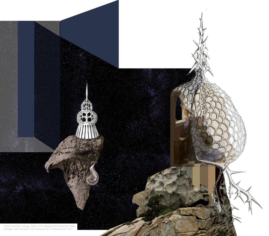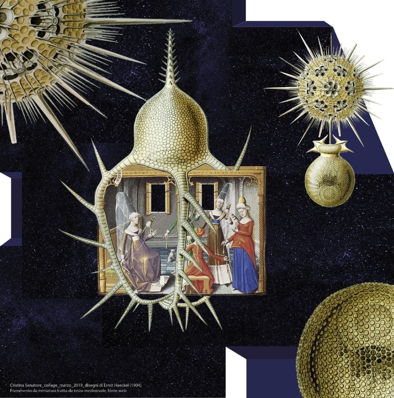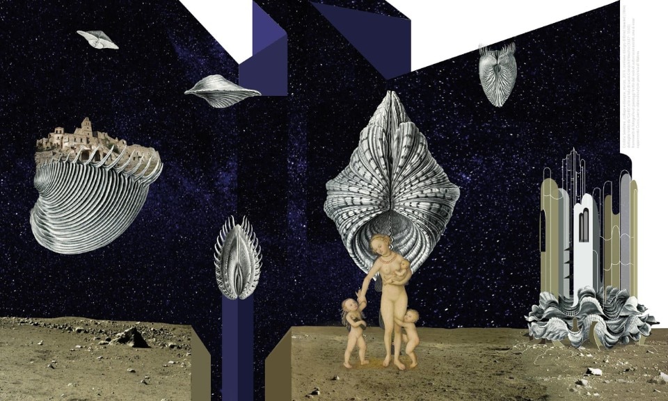 Re-writing or stratification based on pre-existing realities is the work on drawing by Cristina Senatore. For example, in Scenari Futuri, a series of collages from 2019, the drawings of biologist Ernst Haeckel become "architectural natures", shells suspended in interstellar space or on the sand of dark, desert planets, telling us of a post-catastrophe elsewhere, but also of continuity and survival, and of a new centrality of "wise and resilient" women.