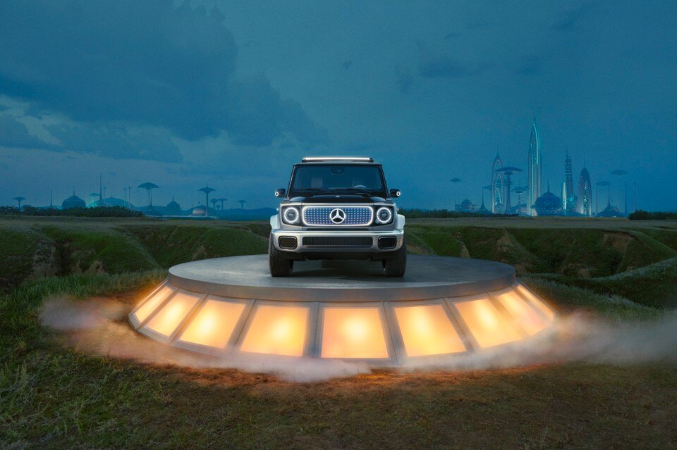 The general boxy-ness of the G-Class design is somewhat preserved, while the two-tone colour option is in line with the look of the first version of Mercedes-Benz' luxury sedan, the EQS. The front grille is lit up with an array of LEDs, and so is the spare tire box in the back.