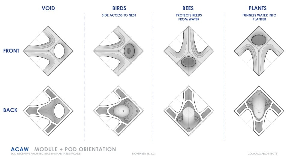 Parnther, Lapp and Wu developed the tessellation system of slip cast pods within sculptural terracotta facade panels. Here, each individual module has a sculptural, arrow-like form composed of three points and circular openings that can be fitted with nested pods to provide wildlife with a living space beneath the surface of the facade. The ceramic modules have been glazed in shades of blue and white and covered with decorative ribbed surfaces to create rippled, textural patterns on the building facades when fastened together in their tessellated formation.