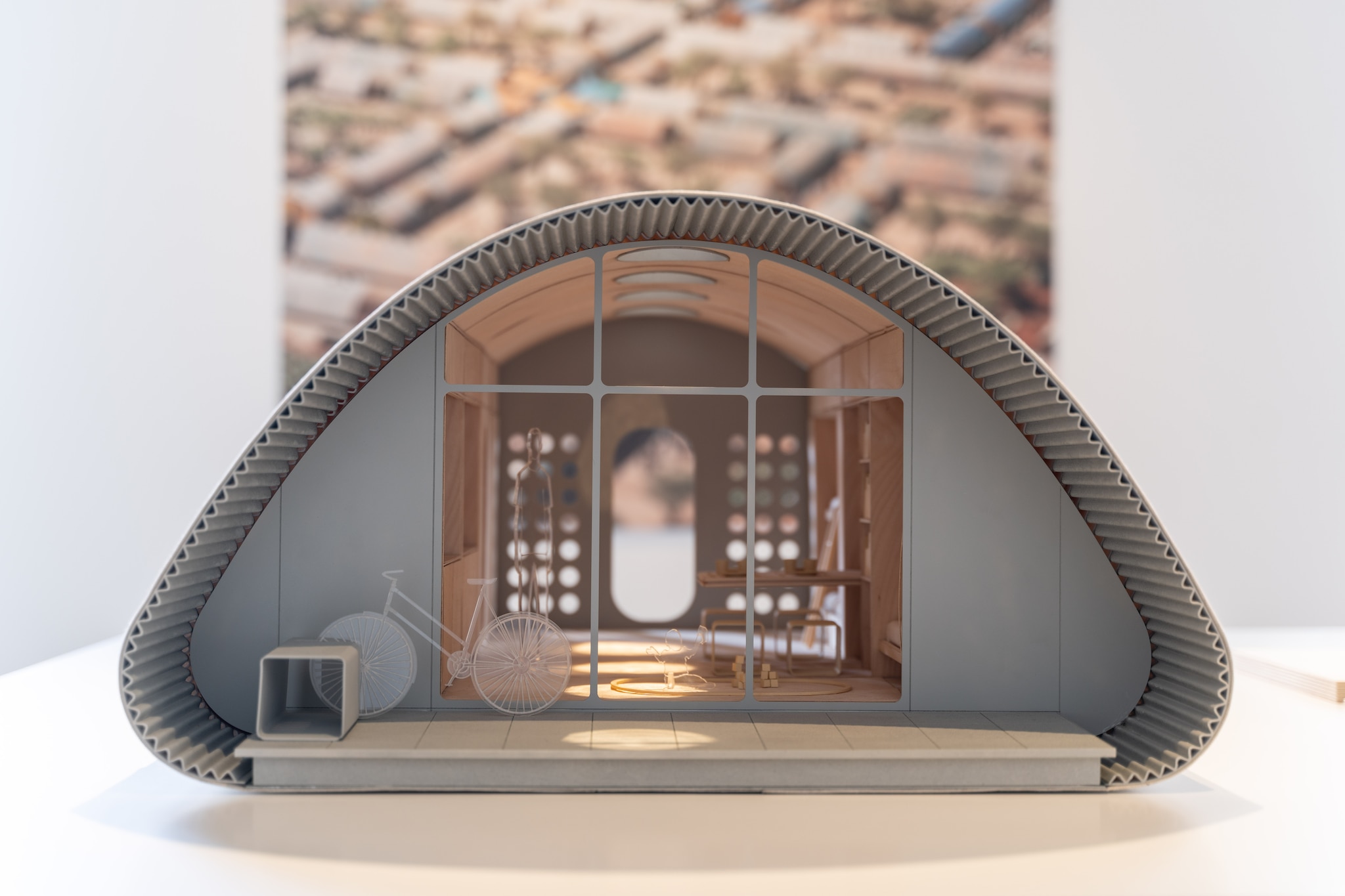 This first time was in 2021 with Zaha Hadid Architects, when the same format was followed to experiment with sustainable types of concrete. The format’s aim is both practical – to show the latest construction practices – and cultural, to define and legitimise positive narrative about an often-stigmatised material. And so, the Essential Home is distinct for its innovative weight-bearing shell, made of a double layer of roll-up fabric impregnated with low-carbon cement and draped over lightweight formwork. Once the fabric is sprinkled with water, it solidifies in 24 hours.