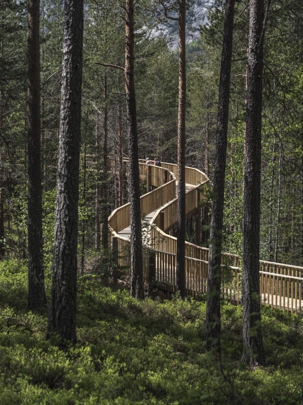 In Hamaren Activity Park in Fyresda, Norway, architecture firm EFFEKT recently completed the construction of a tree walkway. The structure, raised to a height of 15 meters, guides visitors from the pine forest floor, past a lake and up through the treetops to the top of the Klokkarhamaren hill, for a total length of one kilometer.