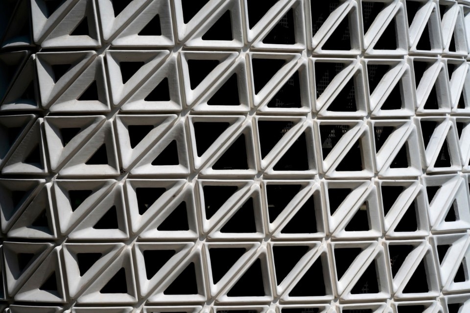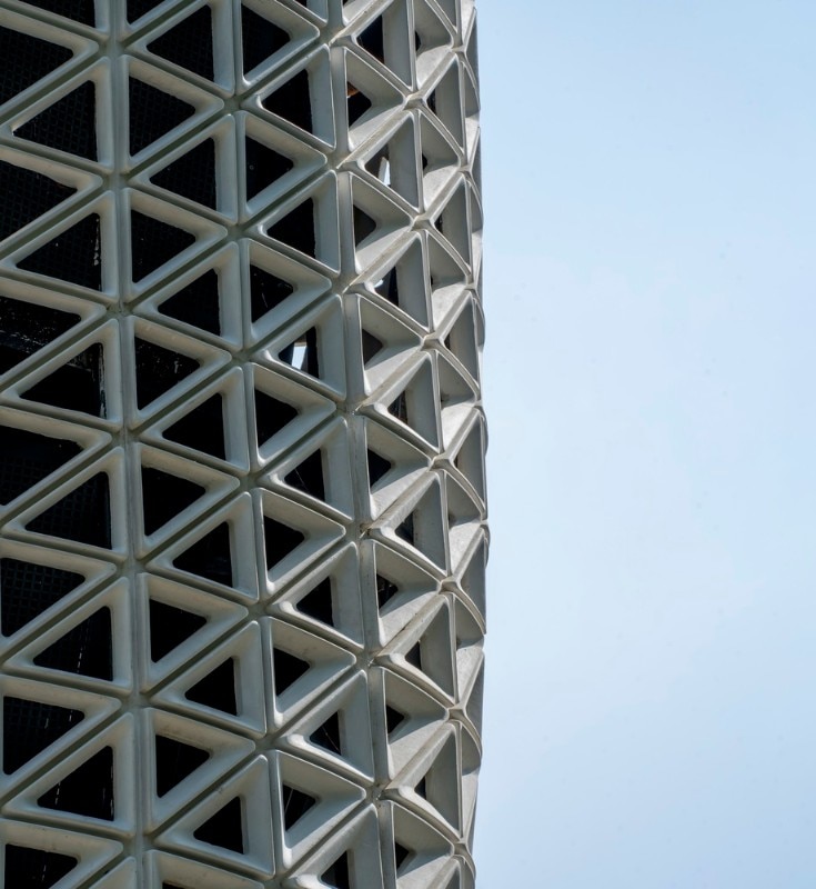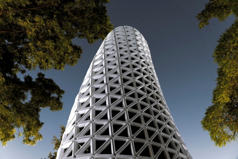 These mini-architectures are composed of a single triangular module. Each component is tapered to create wind compression and thus increase air buoyancy. The drilling pattern is designed as a performance-oriented system, with larger openings in the inlet and outlet areas that accentuate the helical movement of the tower. Based on a plug-and-play design, Vetro can be shipped in a flat package and easily assembled on site due to its modular GRC panel system.