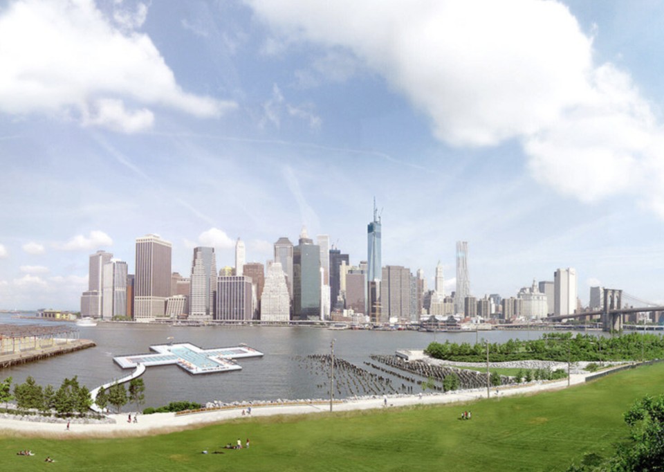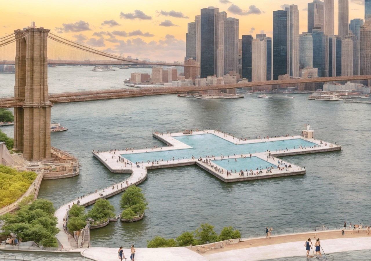 One example is Battery Park City in New York, developed from the 1980s on reclaimed land along the Hudson River, adjacent to the original World Trade Center site. Before the area was formally redeveloped, a temporary urban beach had emerged spontaneously on the site, used informally by residents for swimming and leisure during a pause in construction—an improvised and unplanned aquatic space in the heart of the city.