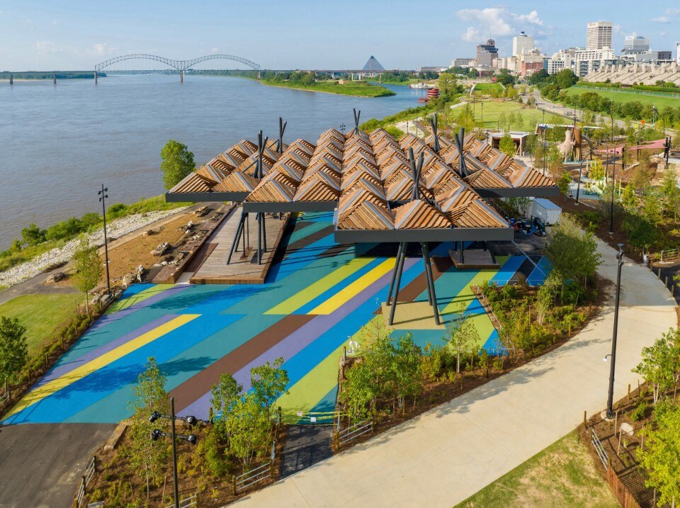 Along the Mississippi River, U.S. studios Studio Gang and SCAPE have designed a public park in the city of Memphis. Officially named Day One at Tom Lee Park, the park includes 31 acres of land along the river, with pedestrian paths, fields, riverfront terraces, and a large activity area sheltered by a massive laminated wood canopy. This canopy covers a basketball court with a surface designed by Memphis-born artist James Little.
