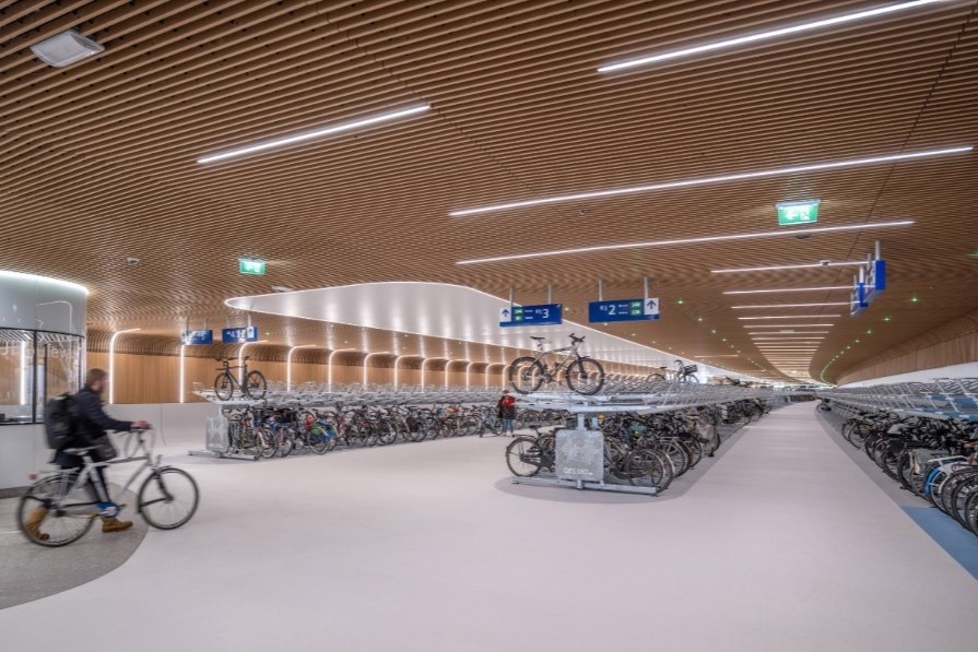 Visitors can access the hub directly by bicycle via ramps on the east and west sides of the building, or alternatively via stairs to the center. The large glass surfaces around the stairs allow natural light to filter in and offer a view of the parking lot from above, providing a sense of safety for users of the building. Finally, the symmetrical layout of the vast, column-free spaces features slatted wood ceilings and walls and bright white floors.