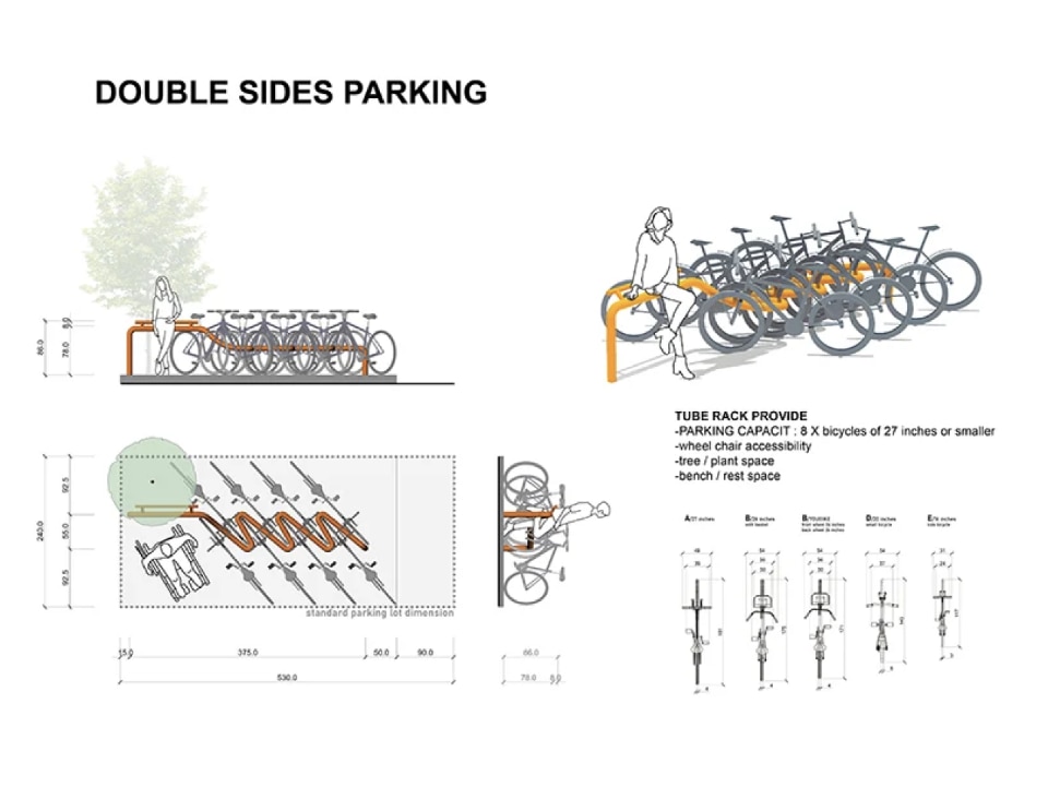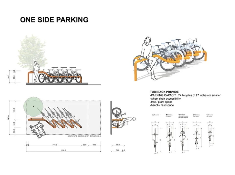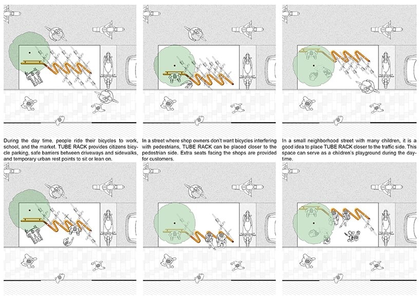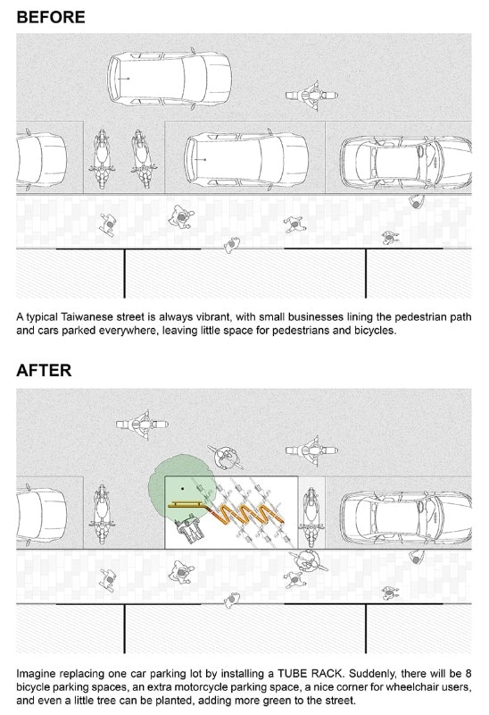 The designers approached the congested streets of Fujin Village,seeking a solution to the urgent need for more open and accessible urban spaces. TUBE RACK would replace the area normally occupied by traditional car parking, creating space for eight bicycles, an additional area for motorcycles, wheelchair-accessible corners, and the possibility of planting a small tree. Its flexibility allows for strategic placement that accommodates both commercial interests and pedestrian flow, providing additional seating for customers or transforming into a play space for children during the day.
