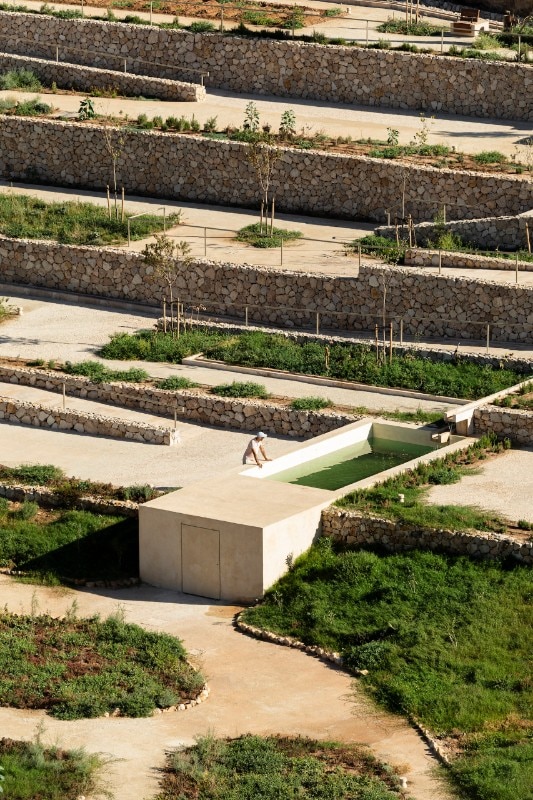 The unevenness of the natural depression is solved through a sequence of pre-existing terraces, restoring their dry stone walls with additional stones from, like all natural materials used in this project, the waste piles of nearby quarries. Stairs and ramps were implemented on these walls to define paths and provide access to the different levels. The paths are accompanied by a restored network of water channels that once provided irrigation to the various crops grown on the terraces, while the two pools that served as reservoirs for this system have been put back into use.