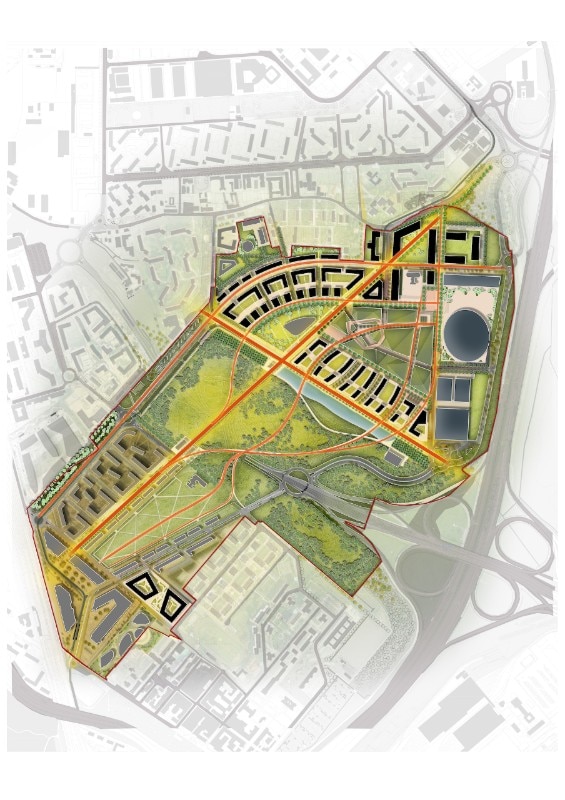 Compositively, the organisation of the masterplan is given by two main axes: a diagonal with a mainly cycle-pedestrian and public transport vocation that crosses the park and the pedestrian axis facing the park and skirting a future large lake. On the structure of these routes is grafted the design of the urban boulevards that make up the urban fabric of the district, connecting a system of squares and public functions with open spaces, tree-lined avenues, residential streets and gardens.