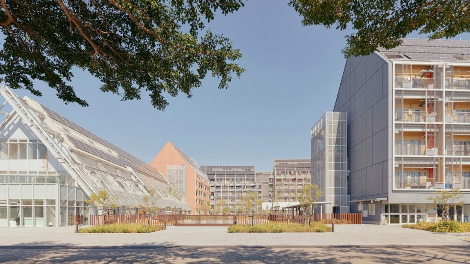 In the center of the site are small gabled volumes clad in corrugated polycarbonate panels, which contain a communal kitchen for residents to cook using food from the surrounding urban farm.