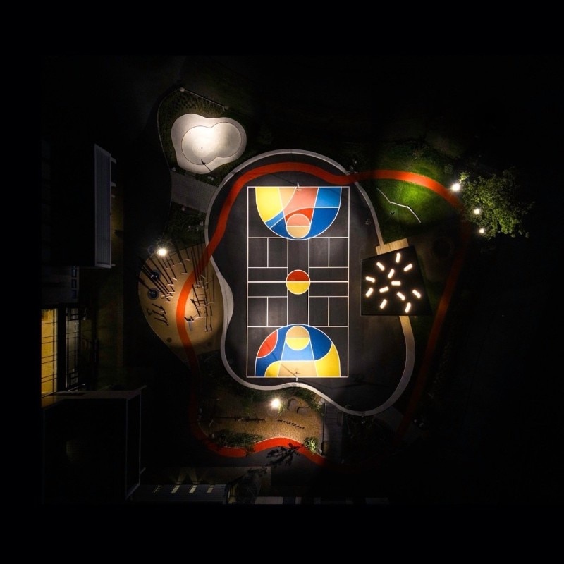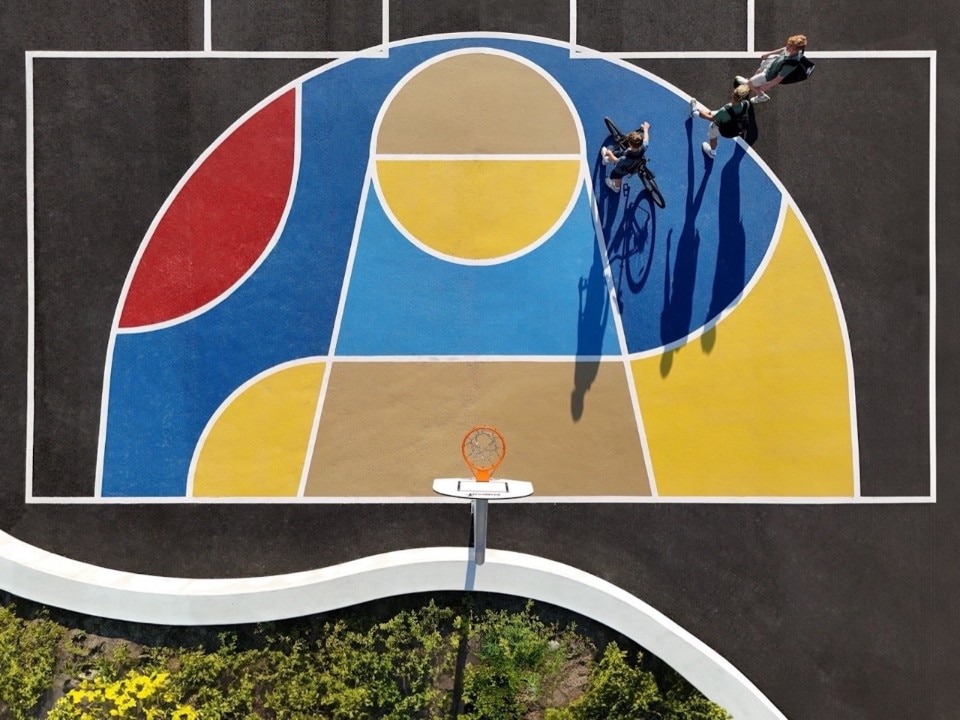 The project is developed around a red ‘ring’, a continuous ring that serves as a pedestrian and bicycle path, connecting the different areas of the park. Within the curve, areas dedicated to play, sport, relaxation and socialisation alternate, creating a balance between dynamic activities and quiet spaces. The centre of the ring, on the other hand, houses a flexible square, suitable for events of various kinds, from football matches to outdoor cinema screenings. A scenic roof ensures that the space can be used all year round, regardless of weather conditions.