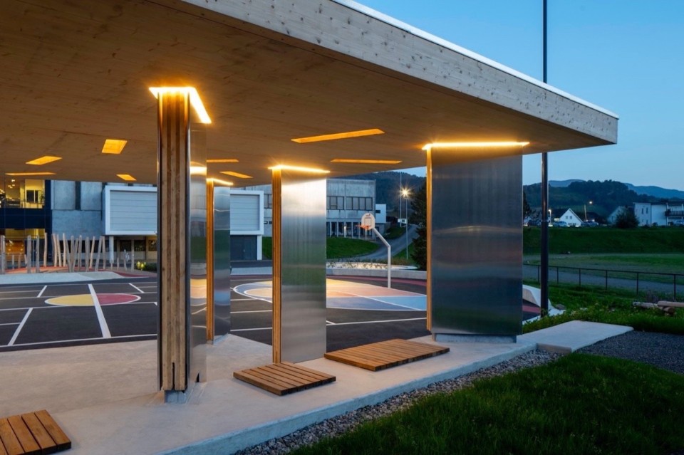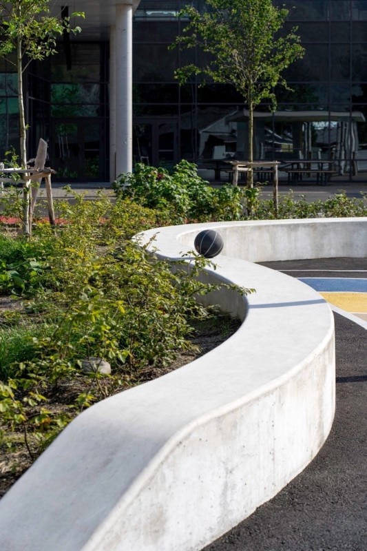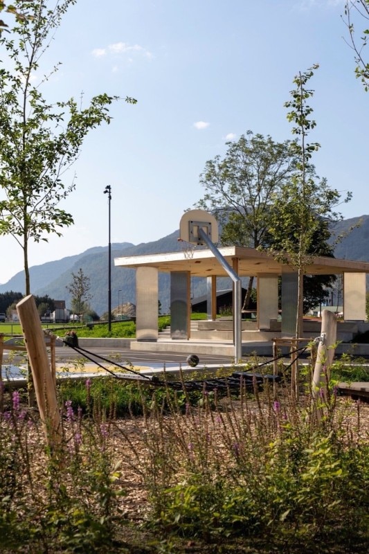 The materials used include recycled aluminium from a nearby foundry and cross-laminated timber (CLT), while green roofs contribute to rainwater management and landscape integration. The project is a virtuous example of the ‘renaturalisation’ of previously asphalted areas, promoting a more ecological approach to the design of public spaces.