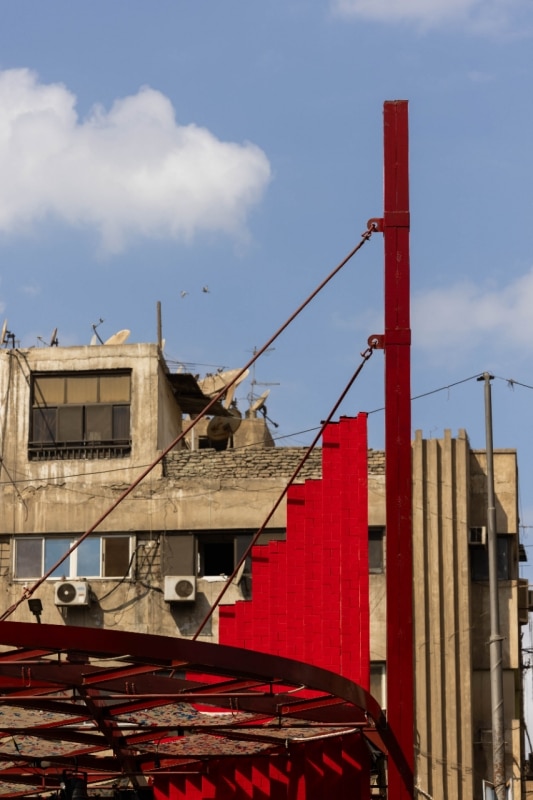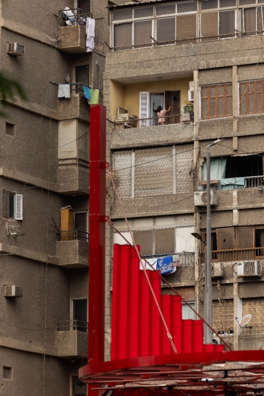 The intervention is part of CLUSTER's larger Along-the-Line program, dedicated to the reactivation of contested spaces along the Nile. The park itself has been undergoing transformation and appropriation for years: fences, billboards and speculative projects have reduced the green space, fueling fears that it may disappear altogether. In this context, the visibility of Pergola -- a red tower that stands out against the backdrop of billboards and traffic -- becomes a political and urban act.