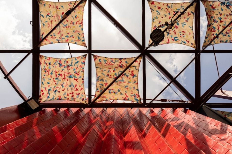 The building, almost entirely made of recycled plastic, represents another level of experimentation. The materials come from waste collected in the Nile and from construction sites, processed by Egyptian companies that specialize in reusing polymers. The metal frame supports panels and blocks of regenerated plastic, demonstrating the structural and symbolic feasibility of recycling in a context of serious environmental and waste management concerns.