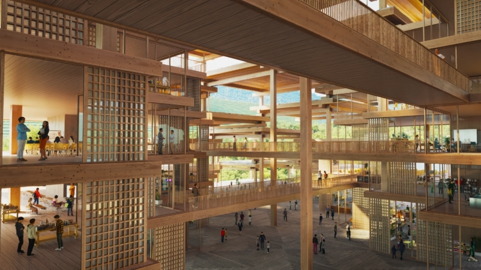 Key element of the master plan is the new Gelephu International Airport, the country's second international aviation infrastructure. Designed by BIG with NACO, it is conceived as a large modular glulam structure, organized into freestanding frames that can be disassembled and reassembled. "The problem with growing airports is the sum of successive, often inconsistent additions," Lyng notes. "Here the ability to expand is already built into the structural system, so the building remains legible decades from now."