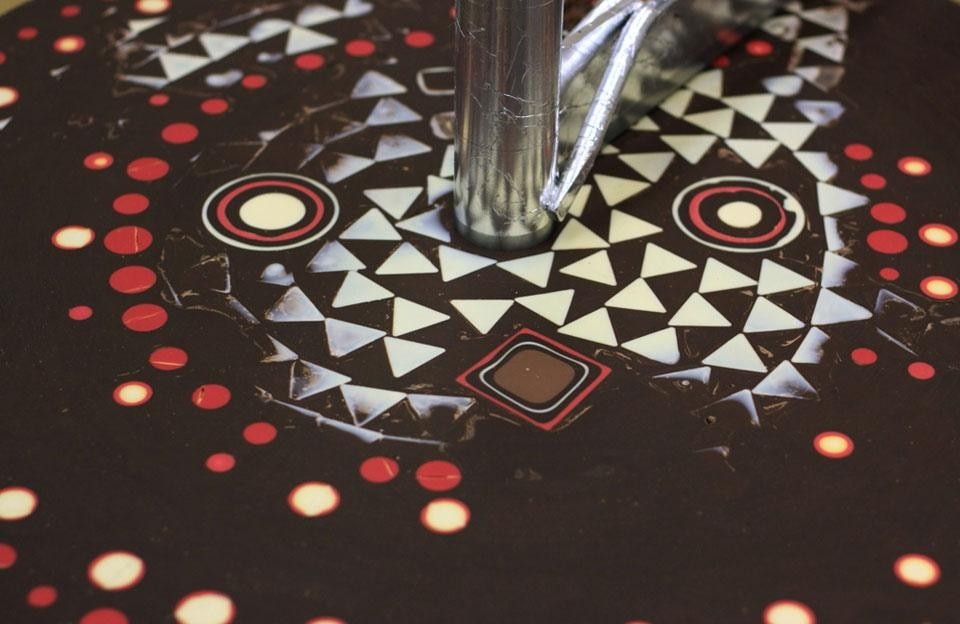 Creating a flipbook effect as the layers are scraped off, an African Bobo mask emerges (cocoa pickers believe they have special powers for a good harvest) or a dancing couple spinning in never-ending pleasure.