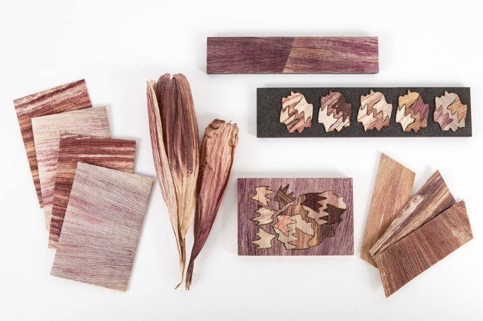 Per creare questo materiale Fernando Laposse lavora dal 2016 con un gruppo di famiglie contadine nello stato di Puebla. Con il sostegno del CIMMYT, la più grande banca di semi di mais del mondo, ha lentamente reintrodotto le sementi autoctone nel villaggio di Tonahuixtla, riproponendo forme tradizionali di agricoltura. Le bucce raccolte, considerate solitamente dei materiali di scarto, vengono ora trasformate dalle donne locali in materiale da impiallacciatura, creando nuovi posti di lavoro.