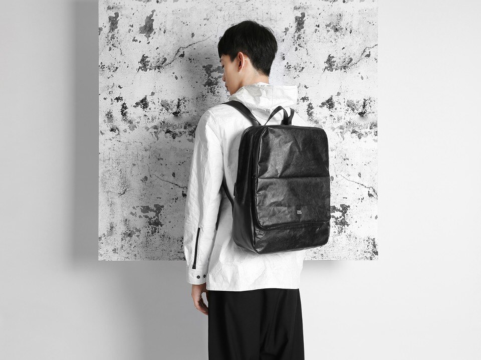 Stile e sostenibilità sono i valori fondanti dell’azienda, il cui nome unisce i termini “fibra” e “forma” per indicare le infinite possibilità del materiale. Nello specifico, la giacca nell’immagine qui sotto è realizzata con la versione a struttura morbida del materiale, mentre gli zaini sono in Tyvek® a struttura rigida.