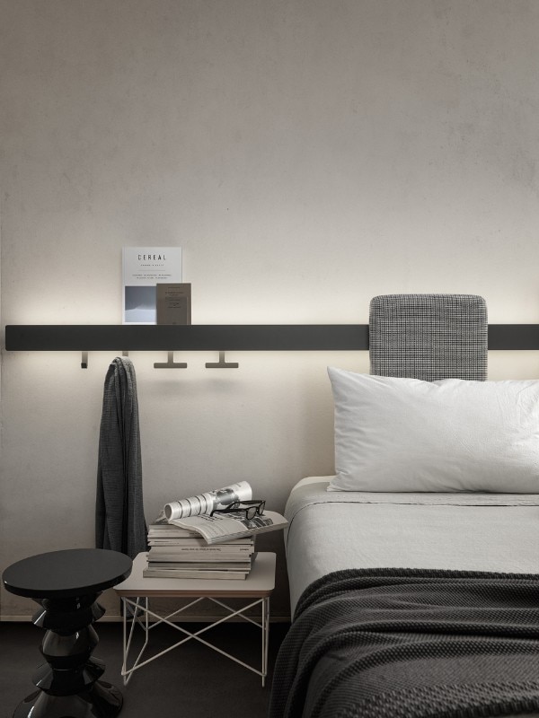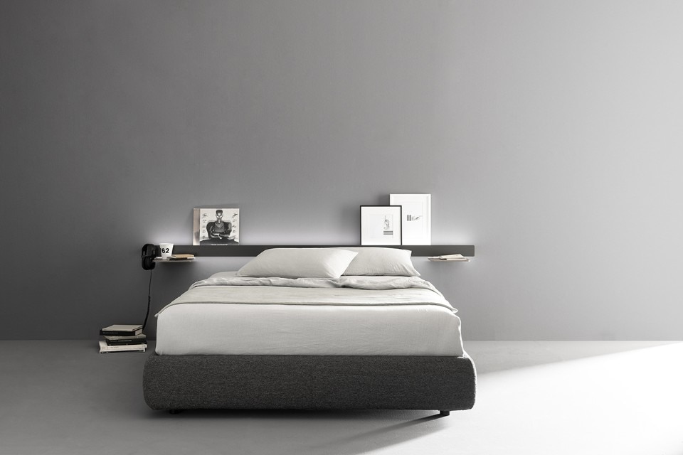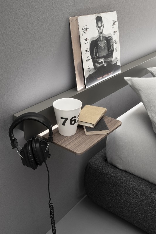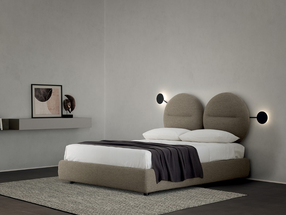 Tra le nuove proposte personalizzabili troviamo il letto Bishape, disegnato da Monica Graffeo, caratterizzato dalla testiera divisa in due parti e che può essere composta da geometrie diverse: cerchi o rettangoli. Ai lati della testiera troviamo un originale supporto luci che può essere ruotato di 90°. Let’space dispone di una speciale testiera che può essere configurata dimensionalmente al millimetro, occupando tutta la parete in caso di nicchia, o muoversi liberamente al centro della stessa. La testiera diventa quasi una boiserie, con una profondità di 13 cm in cui riporre libri, riviste, effetti personali o fotografie.