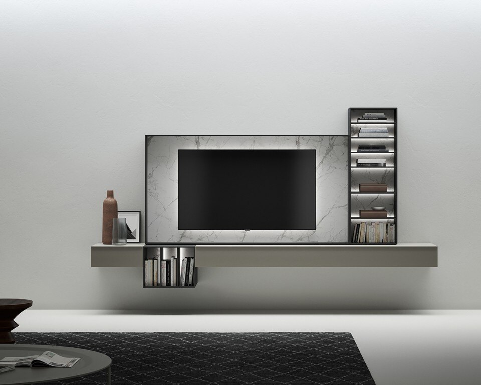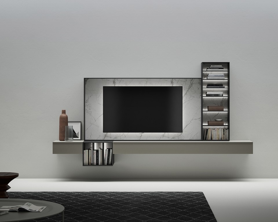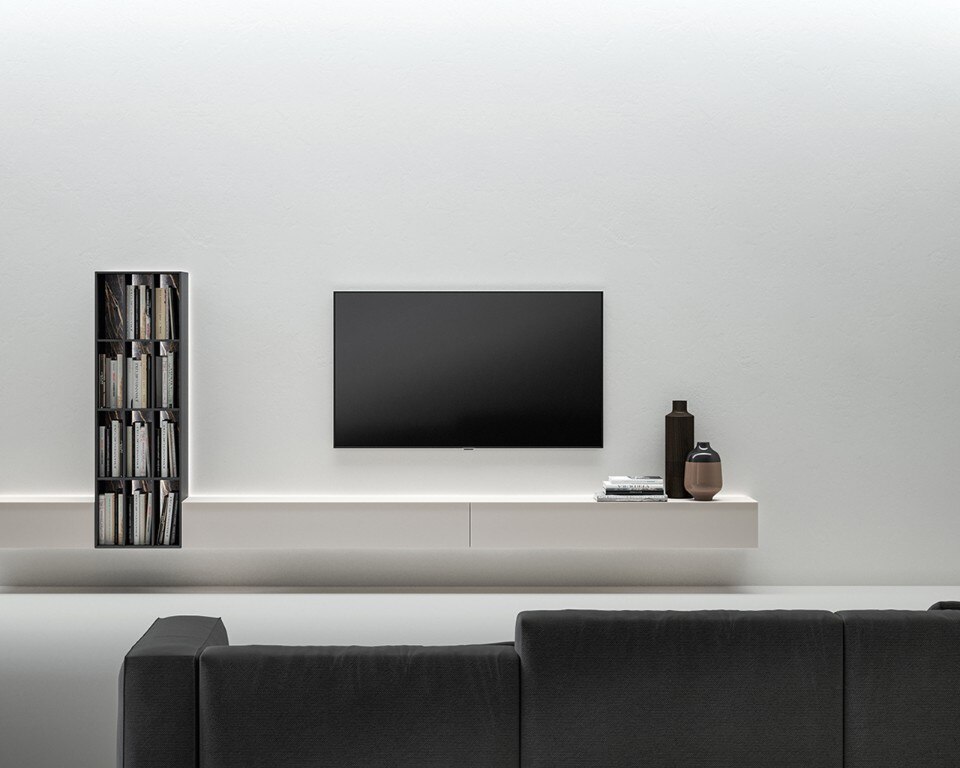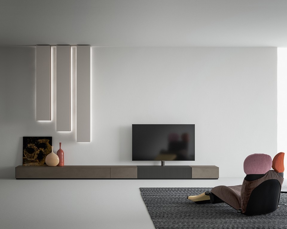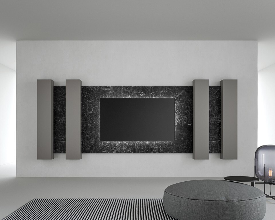 Per Wallover® di Caccaro questo si traduce in diverse accortezze progettuali che rendono invisibili il cablaggio dei dispositivi elettronici, svincolano la composizione della parete dal posizionamento delle prese elettriche e incorniciano la TV come fosse un quadro o una finestra.