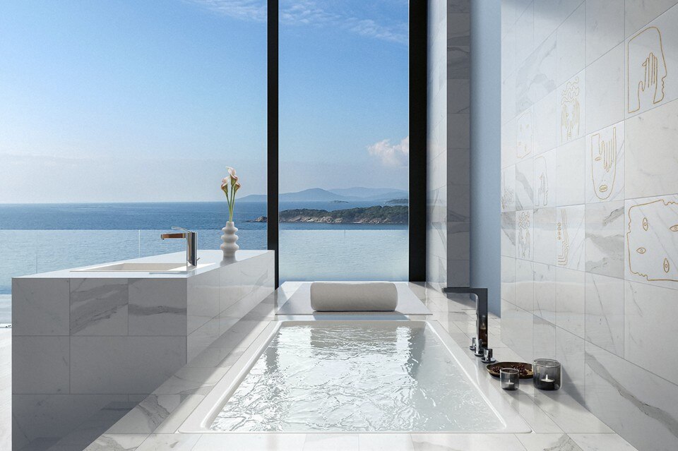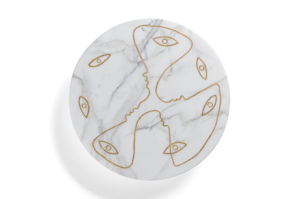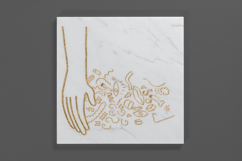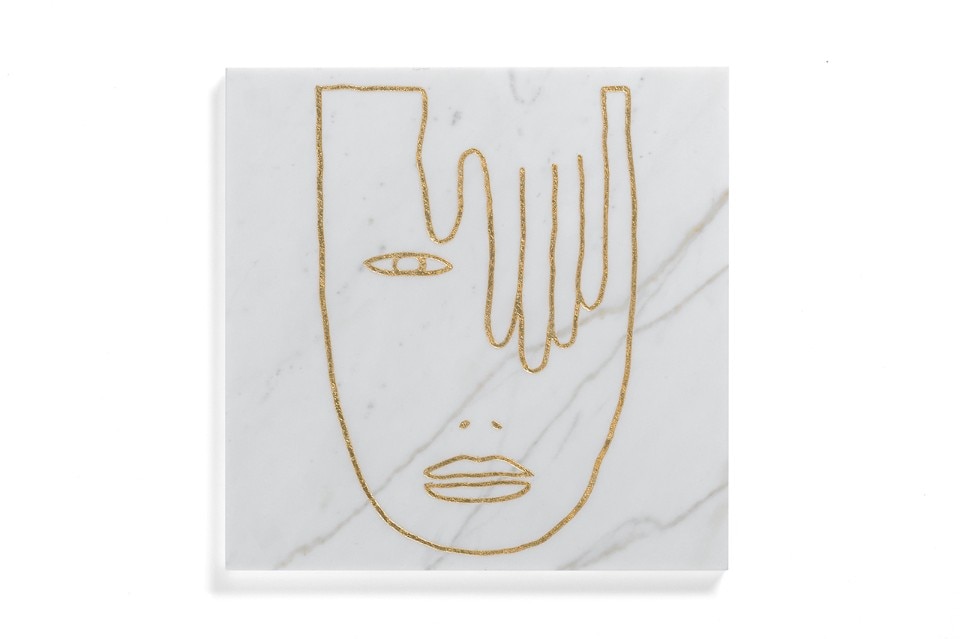 Realizzata con uno dei più pregiati marmi di Carrara di SAGEVAN®, il Calacatta, la composizione presenta tavolini (design Natascia Bascherini), mattonelle, boiserie e piatti ornamentali per interni, dove le sinuose venature del marmo intrecciano incisioni rappresentanti volti, mani, sguardi e simboli, espressione di cambiamenti in corpi nuovi.