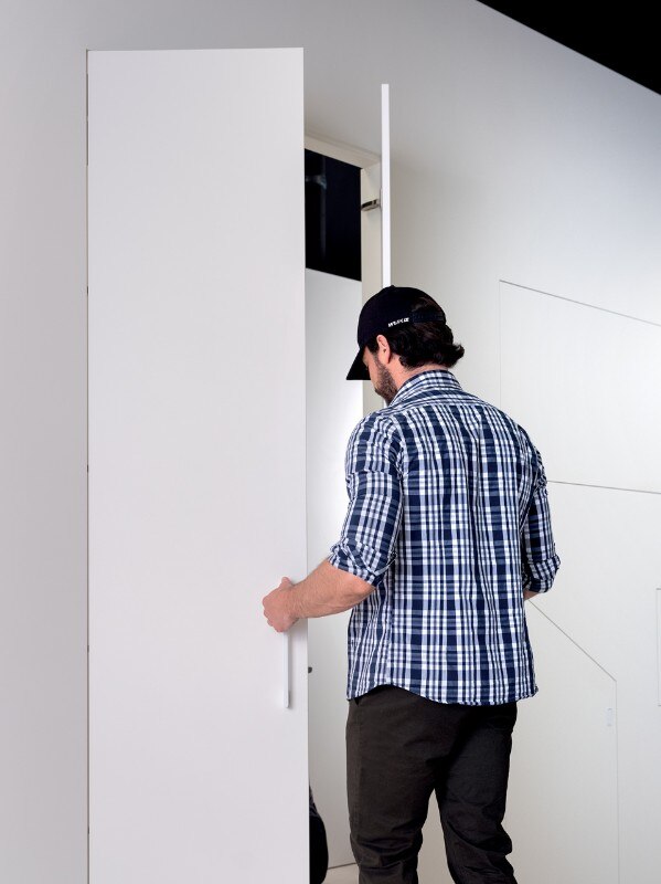 Eclisse Syntesis® Areo è la soluzione versatile, pratica e discreta per celare cabine armadio, scarpiere, nicchie, sottoscala attrezzati, vani tecnici e quadri elettrici con un effetto filo muro totale.