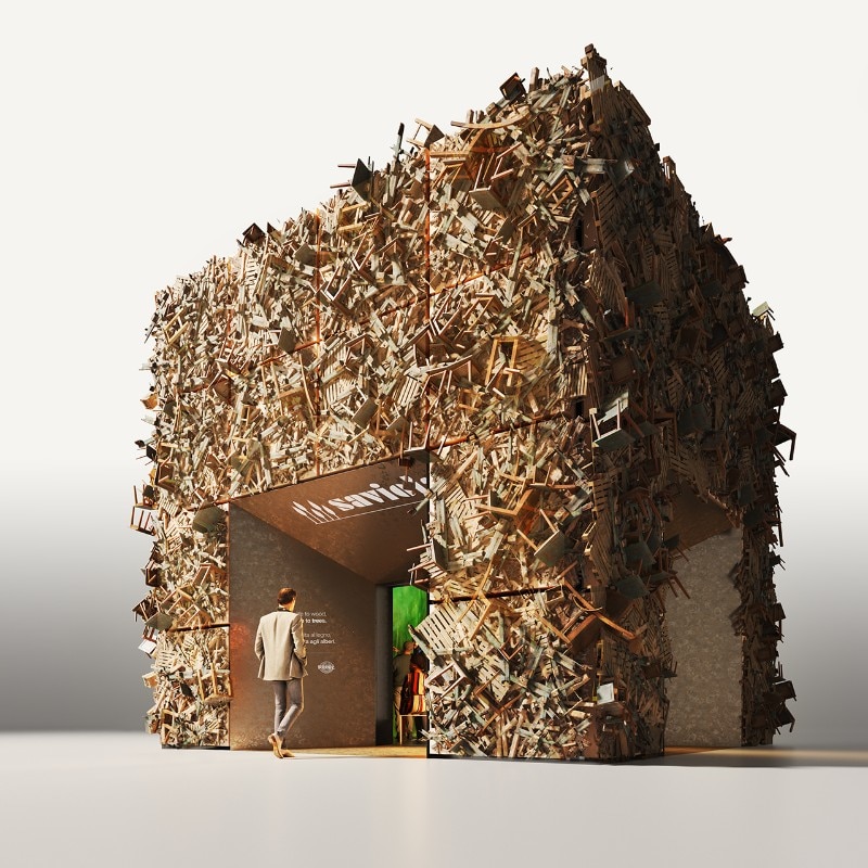 La facciata dell’installazione è composta da quattro tonnellate di materiale di scarto, per mostrare l’intero processo di trasformazione del legno post-consumo. Al suo interno, si può trovare una stanza immersiva che evidenzia tutto il potenziale della stampa digitale nella realizzazione di progetti su misura di impatto e sostenibili.