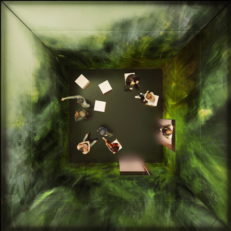 Lo spazio interno del padiglione accentua l’uso di tecnologie di fabbricazione avanzate per la produzione di pannelli personalizzati. Passando attraverso un portale che richiama l’effetto dell’acciaio, i visitatori vengono fatti entrare in uno spazio immersivo costruito con oltre cento pannelli dal marchio “pannello Ecologico”, composti al 100% da legno riciclato.