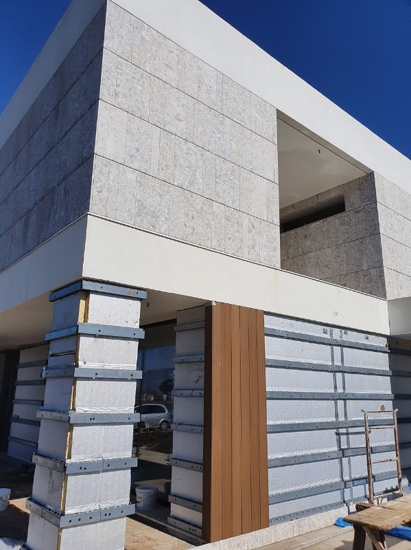 La compatibilità universale del sistema Isotec Parete è ciò che ha permesso alle architette di comporre liberamente le facciate, fissando ai correntini metallici sia materiali di rivestimento leggeri, che più pesanti. Isotec Parete è stato posato in orizzontale, con un passo 65,2 cm per il piano superiore, per accogliere le lastre in marmo, e con passo 40 cm per le facciate inferiori, rivestite con i listoni in legno composto. Tutte e due le tipologie di finitura sono state fissate ai correntini metallici di Isotec Parete con apposite clip e morsetti a scomparsa, per un effetto finale estremamente elegante e lineare.