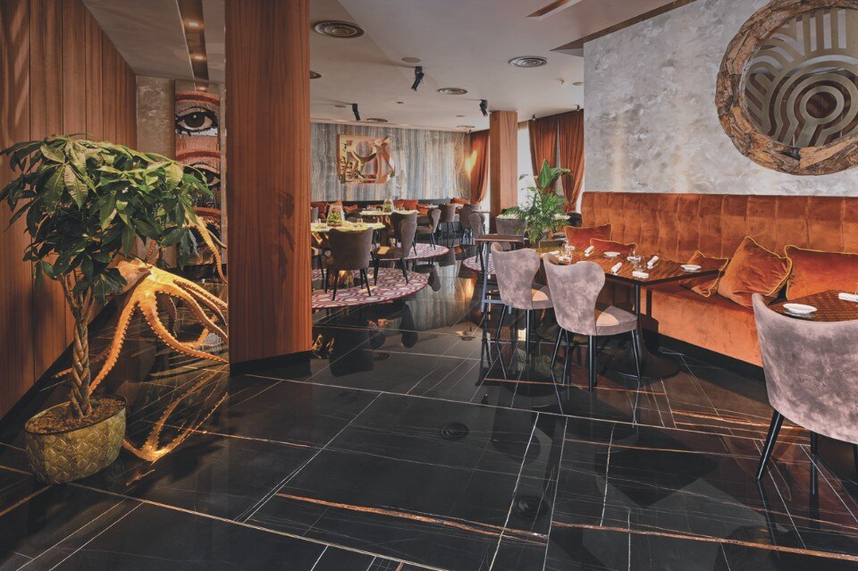 L’ambiente Living, quello più rilassato e informale, è dominato da un lungo american bar, attorno a cui sono disposti vari sgabelli, tavoli e divanetti. L’arredamento è esaltato dalla pavimentazione in ceramica tecnica Sahara Noir di FMG che richiama un raffinato marmo: il suo fondo nero assoluto viene animato da lampi affilati e netti color caramello, arancio e crema, che richiamano e riflettono le sfumature oro e le luci calde che inondano l’ambiente. Le pareti sono invece caratterizzate dalle striature sinuose di Onice Grigio di FMG, che presenta una successione di venature ocra, sabbia e cenere, creando un effetto altamente decorativo e ricercato.