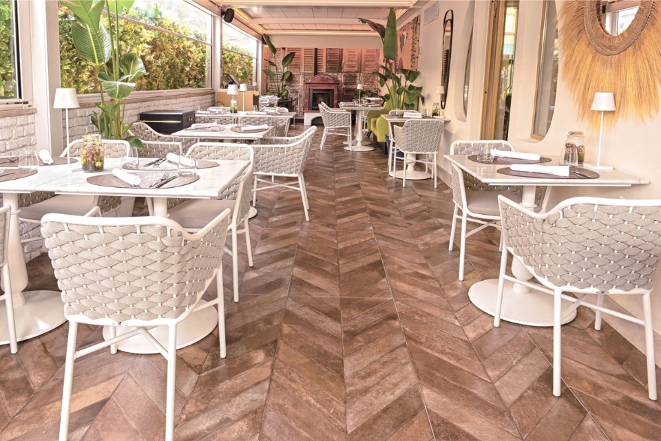 Il ristorante presenta poi all’esterno una veranda che ospita un'area lounge in cui Whole Chevron Cotto di Iris Ceramica scalda l’ambiente con il suo sapore artigianale, dialogando con naturalezza con i materiali degli arredi, tra cui la maiolica rossa della stufa-caminetto. La posa a spina di pesce scandisce lo spazio con garbo e dinamicità, ampliandone la percezione delle dimensioni.