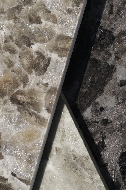 La collezione Selenite Maximum introduce l’esclusiva finitura Jewel che conferisce un effetto ancora più vivido e romantico alle superfici. Grazie a un’intesa alchemica tra un minerale iridescente e un materiale vetroso, la luce si scioglie in una colata cristallina che si lascia condurre tra i varchi della trama, per un effetto pietra lussureggiante nei suoi riflessi argentei.
