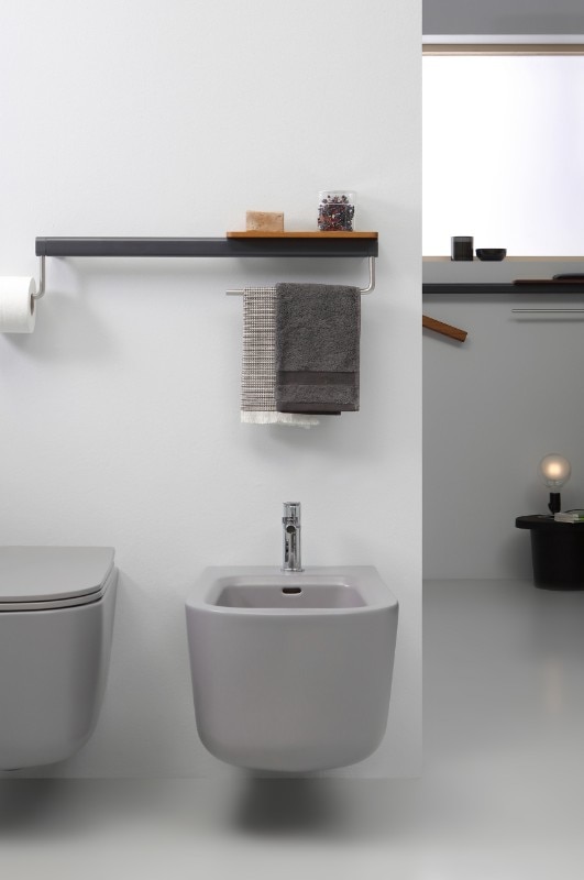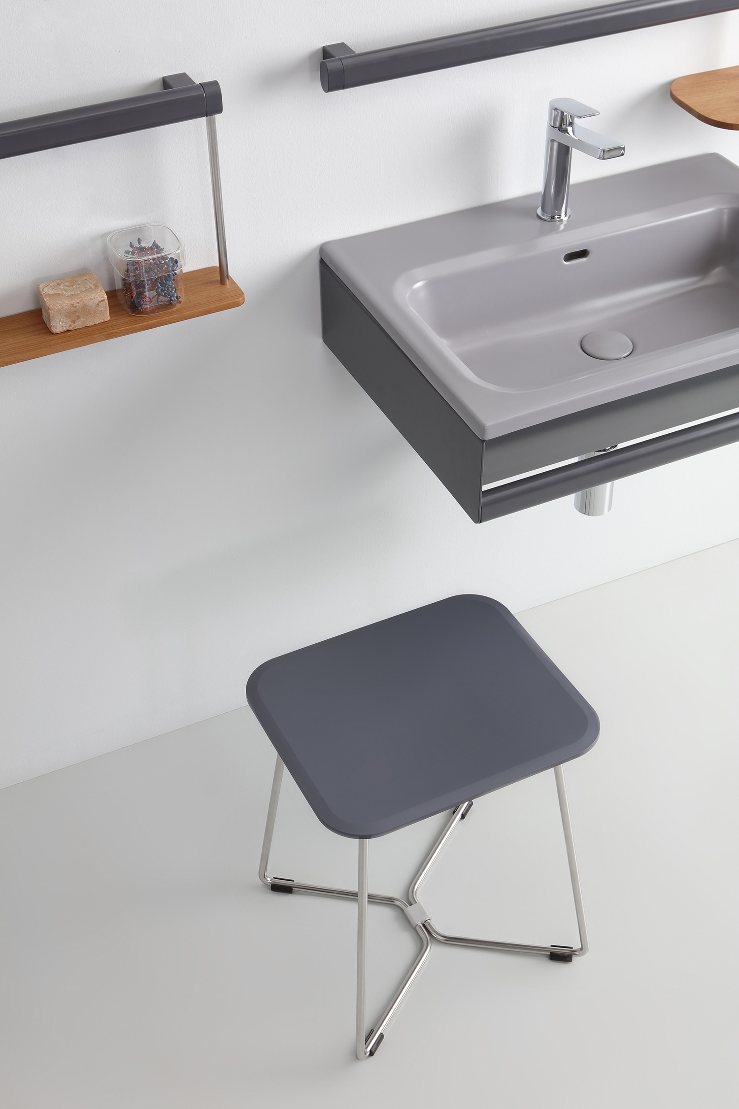 Omnia prevede anche una scelta di sedute: sgabello e seduta doccia a ribalta (per quelle situazioni dove la parete non garantisce una buona tenuta). Il piano inclinato che percorre il perimetro della seduta è un segno grafico che si ripete anche in altri prodotti della collezione, come il lavabo e il bidet. Questo sistema bagno propone poi, oltre ai sanitari a terra e sospesi, due formati di lavabo in ceramica – 65 e 100 cm – e uno in Corian (sempre di 65 cm). I lavabi dalle forme minimali si completano con una struttura di metallo provvista di maniglia di avvicinamento, un portasciugamano e un porta oggetti laterali. La collezione include anche specchi, disponibili in tre versioni, con varie tipologie di illuminazione e sistemi di sicurezza.