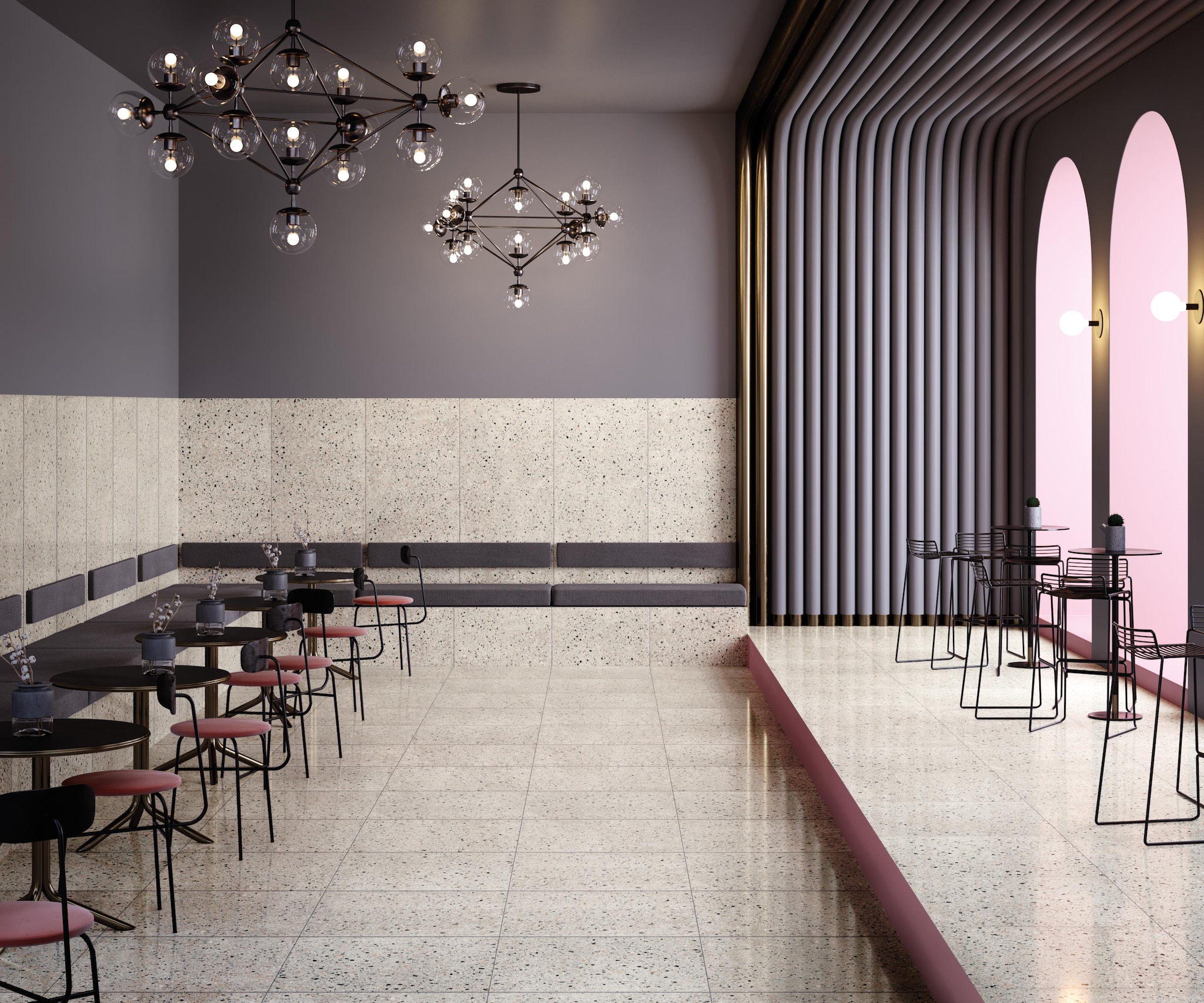 FMG offre cinque progetti Full Body³ ispirati a materiali iconici reinterpretati in chiave contemporanea. Venice Villa e Venice Villa Rialto rinnovano il terrazzo veneziano con graniglie vivaci e tessiture raffinate; Palladio valorizza la compattezza del battuto veneziano con un mélange fitto di frammenti colorati. Neo Granito omaggia la roccia vulcanica con una tessitura densa e decorativa, mentre Quarzite ripropone la roccia metamorfica con una superficie materica e sfumature brillanti. Tutte le proposte sono declinate in una ricca gamma di formati, finiture e colori, per offrire la massima libertà progettuale.