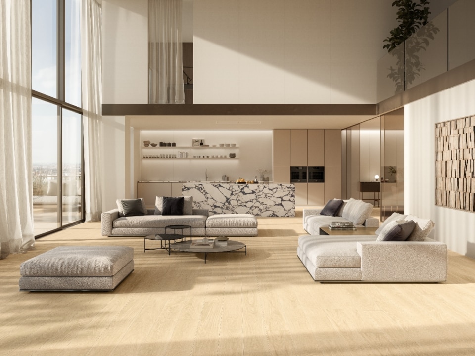 LOG Select è l'essenza del rovere. L'universo LOG, già protagonista a Cersaie 2024, si arricchisce di un capitolo nuovo e raffinato. Non più il legno rustico e autentico, ma una selezione di rovere purissimo, senza nodi. È una collezione per chi comprende che la vera eleganza non sta nell'ostentazione, ma nella sottrazione. Una bellezza sobria e sofisticata, pensata per ambienti moderni che respirano, che hanno bisogno di un'anima calma e rassicurante.