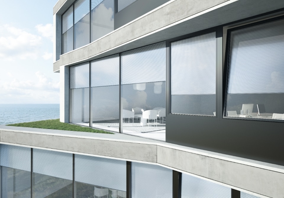 Schüco Integralmaster integra la tenda nel serramento, regolando luce e privacy con un gesto e senza ingombri visivi.