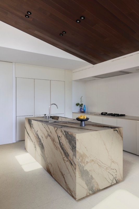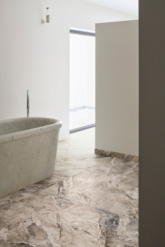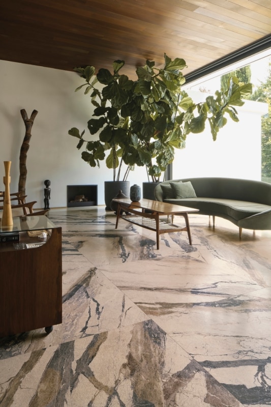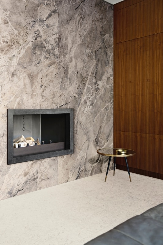 Otto superfici articolate in due famiglie – Expressive e Structural – danno forma a un sistema aperto, capace di generare infinite combinazioni. La prima racconta emozioni e narrazioni visive attraverso pattern ricchi e cromie calibrate: dal vibrante Arabescato Grigio al più audace Breccia Blu, dal materico Ceppo Aragona al dinamico Breccia Phoenix. La seconda, invece, è un esercizio di misura: superfici come White Aura, Havana Burlington, Roche Bleue e Pietra di Fez definiscono spazi essenziali, coerenti, architettonici.