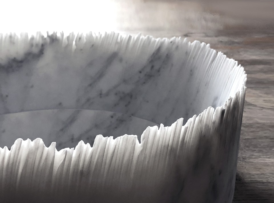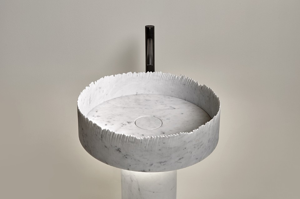 Ulian valorizza il comportamento “spontaneo” delle macchine a controllo numerico water-jet, utilizzate solitamente per lavorare i materiali lapidei. Questi strumenti tendono a creare delle onde curvilinee irregolari a rilievo che possono idealmente ricordare l’effetto sfrangiato di una plissettatura di tessuto. Il designer rovescia la prospettiva secondo cui questo è visto come un difetto di produzione da evitare, e lo trasforma in una lavorazione originale e virtuosa. Grazie a questa operazione si possono ottenere tre o più lavabi di diametri diversi da un solo blocco di marmo (uno dentro l’altro), diversamente dalle lavorazioni tradizionali. Ogni lavabo è contraddistinto da una sua speciale estetica che lo rende un pezzo unico, assolutamente irripetibile.